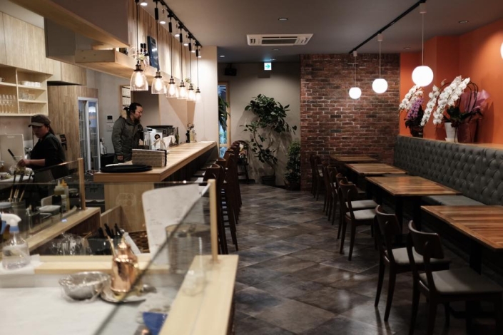 店内に入るとパッと目を引くオレンジ色の壁、ベイクド感溢れる落ち着いた色の床、オープンキッチンの厨房の風景、そこから運ばれてくるpizzaやwineを楽しみながら会話も弾むこと間違いなしですね。